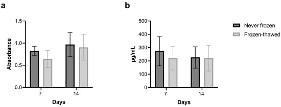 The WST-8 assay shows that viability was comparable between the never-frozen and frozen–thawed groups (Figure 1a). Additional measurements of hPCLS protein content using the BCA assay revealed no differences between the never-frozen and frozen–thawed groups (Figure 1b). These data are consistent with our previous findings in cryopreserved non-fibrotic hPCLS [46] and as shown in Supplementary Figure S1.