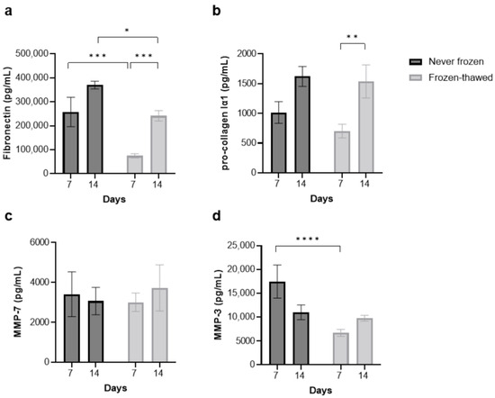 MAGPIX® analysis revealed that except for fibronectin and MMP-3, each of the pro-fibrotic cytokines were secreted comparably between the never-frozen and frozen–thawed fibrotic hPCLS at D7 and D14 (Figure 2). In the case of fibronectin and MMP-3, while a significant difference was observed at D7, it was restored to comparable levels at D14.