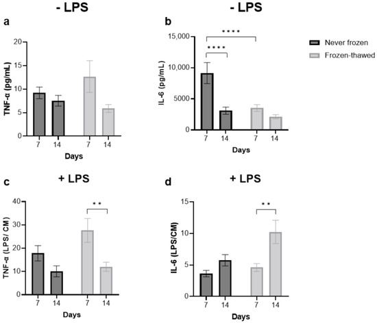 Freezing–thawing the fibrotic hPCLS largely preserves pro-inflammatory cytokine secretion. (a,b) MAGPIX® analysis of endogenous cytokine production revealed that compared to the never-frozen hPCLS, the frozen–thawed fibrotic hPCLS secreted similar levels of TNF-α (a) but significantly less IL-6 (b) at D7. However, these differences were absent at D14. (c,d) With subsequent LPS treatment, the average fold change (relative to pre-treatment) was comparable between the never-frozen and frozen–thawed fibrotic hPCLS at both D7 and D14. Each bar represents the mean and standard error of mean over five fibrotic donors with n = 6 hPCLS per donor for the frozen–thawed group and n = 3 hPCLS per donor for the never-frozen group. One-way ANOVA and Sidak’s test were used. **: p < 0.01, ****: p < 0.0001. See Supplementary Figure S4 for a donor-to-donor breakdown.