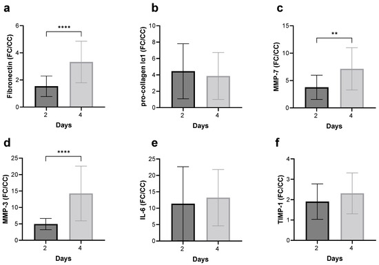 MAGPIX® analysis of pro-fibrotic and inflammatory secretion revealed that compared to the CC-treated frozen–thawed non-fibrotic hPCLS, the FC-treated frozen–thawed non-fibrotic hPCLS secreted at least 2-fold and up to 15-fold greater levels of pro-fibrotic and pro-inflammatory cytokines (Figure 4a–f). In the case of fibronectin (Figure 4a), MMP-7 (Figure 4c), and MMP-3 (Figure 4d), the amount of secretion was greater at day 4 compared to day 2.