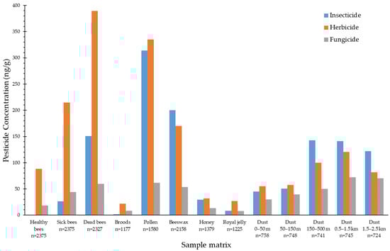 - Calatayud-Vernich, P.; Calatayud, F.; Simó, E.; Picó, Y. Pesticide residues in honey bees, pollen and beeswax: Assessing beehive exposure. Environ. Pollut. 2018, 241, 106–114. [Google Scholar] [CrossRef] [PubMed]