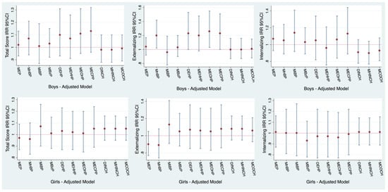 Adjusted cross-sectional associations between concurrent childhood urinary phthalate metabolite concentrations and CBCL scores in boys and girls from the NACII-IT cohort (n = 298). Note: Phthalate concentrations were natural log transformed, so the incidence rate ratio (IRR) and 95% confidence interval (95% CI) correspond to the multiplicative change in the probability of CBCL scores for each 2.7-fold increase in exposure biomarkers. Models adjusted for maternal education (low (0–2), middle (3–4) or high (>=5) ISCED classification), child body mass index (BMI) z-score, creatinine (log transformed), child age at CBCL assessment, season of urine collection (summer/autumn vs. winter/spring) and maternal IQ. The numeric results corresponding to this figure are available in Supplementary Table S2.
