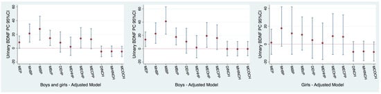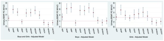When the four cohorts with available urinary BDNF measures were analyzed together, with the exception of DINCH metabolites, each natural-log-unit increase in most urinary phthalate metabolites was strongly associated with higher urinary BDNF levels among both boys and girls together (Figure 4 and Supplementary Table S5): MEP (PC: 4.2%; 95% CI: 0.20, 8.3), MnBP (PC: 19.0%; 95% CI: 12.7, 25.6), MiBP (PC: 14.4%; 95% CI: 8.6, 20.5), ∑DEHP (PC: 13.0%; 95% CI: 6.8, 19.4), MEHHP (PC: 13.5%; 95% CI: 7.7, 19.7), MEOHP (PC: 17.5%; 95% CI: 11.6, 23.8) and MECPP (PC: 9.4%; 95% CI: 3.5, 15.7). Sex-stratified models showed that, among boys, all the previous associations were strengthened (Figure 4 and Supplementary Table S5), while in girls, only MnBP and MEOHP were positively associated. Among girls, inverse associations were also observed between higher urinary DINCH metabolites and lower urinary BDNF levels (Figure 4 and Supplementary Table S5): DINCH (PC: −8.4%; 95% CI: −14.3, −2.2), MHINCH (PC: −11.3%; 95% CI: −16.6, −5.6) and MCOCH (PC: −8.4%; 95% CI: −14.3, −2.2).