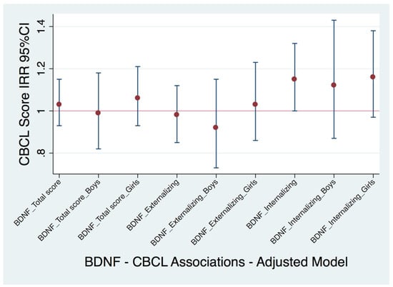 When boys and girls from the NACII-IT cohort were considered together, each natural-log-unit increase in urinary BDNF levels was associated with higher internalizing problems (IRR: 1.15; 95% CI: 1.00, 1.32) but not with externalizing or total CBCL scores (Figure 3, Supplementary Table S4).