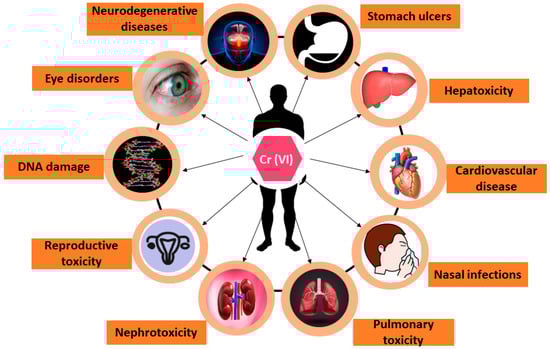 Cr(VI) is one of the major environmental pollutants. According to Nigam et al. [62], there are two possible ways that people might be exposed to Cr(VI): by inhalation (breathing) during an occupational exposure, or through food or water. In another study, Vendruscolo et al. [63] reported that Cr(VI) toxicity may have a variety of negative effects on health, including contact dermatitis, emphysema, internal bleeding, liver and kidney illness, hypersensitivity responses, and DNA damage, as shown in Figure 1. DesMarais and Costa [55] reported that the oxidative stress that Cr(VI) causes in cells might lead to the development of DNA adducts, cardiovascular disorders, and neurological illnesses. An individual may develop lung cancer or irritation/damage to their respiratory tract if they inhale large amounts of Cr(VI) [64]. Cr(VI) toxicity cause health hazards through adverse effects [60,64]. These findings suggest that exposure to Cr(VI) should be avoided for a healthy life, as it causes various types of illnesses in humans.