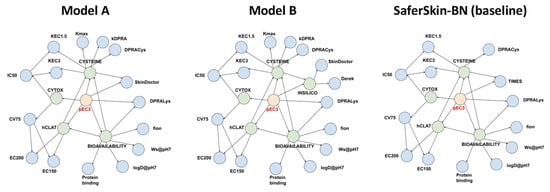 The main parameter obtained in the kDPRA was Kmax, a rate constant for the binding of the compound to the peptide. The assay also defines a threshold in Kmax that best distinguishes between GHS 1A sensitisers and GHS 1B/non-sensitisers. Therefore, this assay provided us with two input parameters for the BN model: Kmax (a continuous variable that we discretised as described in the Methods section) and kDPRA (a binary variable representing the classification into GHS 1A or GHS 1B/non-sensitiser). Table 2 compares BN models with and without kDPRA input parameters. Balanced accuracies for the test set were calculated using four model variants (i.e., models A and B, each with and without kDPRA nodes). The individual predictions for all compounds from the test set by the baseline model, as well as model A and model B, can be found in Supplementary Materials Table S4.
