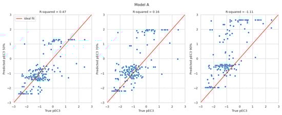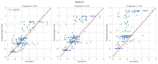 Predicted pEC3 taken at the 50th (left), 70th (middle), and 90th percentiles (right) versus the true pEC3 values for models A and B.