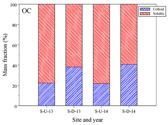 Figure 2 displays the OC mass percentages of colloidal and soluble phases using Equation (2) for two years and two sites. Despite the colloid having a higher DOC concentration compared to the soluble phase (Table 1), the volume fractions were 0.1 and 0.9 for colloidal and soluble phases, respectively. Consequently, the colloidal mass percentages were lower than those of the soluble phase. On average, the colloidal OC percentage was 31.5% with a standard deviation of 14.8%. At site-D, the colloidal percentage was significantly higher at 39.4% compared to site-U, which had a percentage of 22.0% (p = 0.003). The colloidal OC mass percentages in our study were slightly lower than the 32–55% range reported in freshwater DOM studies [38,47,48]. However, they are comparable to the findings of Chen et al. [30], whose study showed an average colloidal OC mass percentage of 30.0% with a standard deviation of 11.5%.