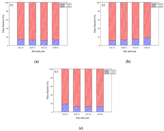 The mass percentages of estrogens distributed on colloidal and soluble phases: (a) (E1), (b) (E2), and (c) (E3).