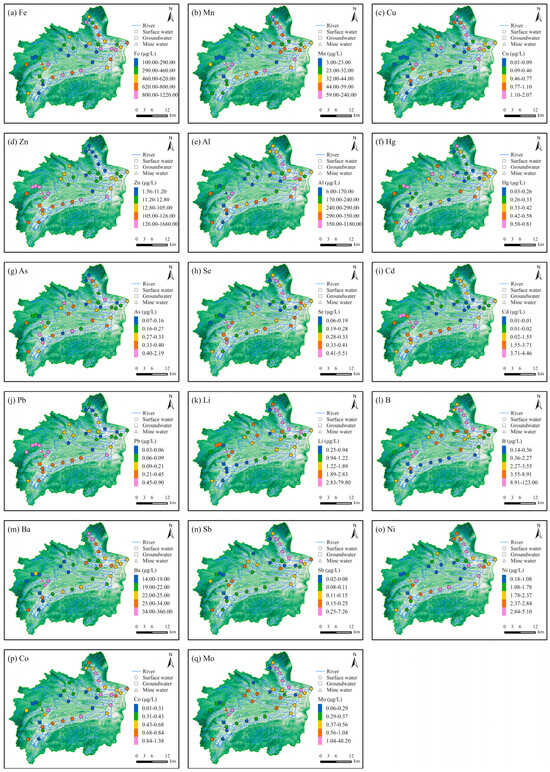 To show the difference in the PTE concentrations, the “GraduatedColorsRenderer” and “Quantile” principle in ArcGIS Pro were used to classify the surface water samples. As a result, each range had different widths but the same observation frequency. The spatial distribution of the Fe, Mn, Cu, Al, Ba, Ni, and Co concentrations followed a similar trend, with elevated levels primarily distributed in the main stream, Xichong River, and Yangchang River (Figure 3a–c,e,m,o,p). The spatial distribution of Zn, Cd, and Pb exhibited similar patterns, with higher concentrations in the main stream and Xichong River (Figure 3d,i,j). Notably, the Cd concentrations in the surface water of the Yangchang River were relatively higher than those in the Xichong River. The spatial distribution of Se, Li, B, Sb, and Mo exhibited similar characteristics, with the concentrations in the tributaries being significantly higher than those in the main stream (Figure 3h,k–m,q). Additionally, the concentrations of Se and Mo in the mine water were similar to those in the surface water but higher than in the groundwater.