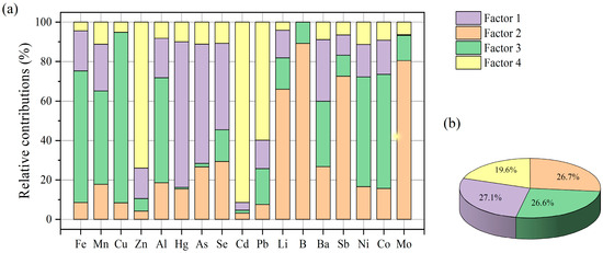 The PMF model was applied to analyze the PTEs in surface water, and the debugging details for ensuring a reliable source recognition effect are presented in Text S1, Tables S1 and S2. Four factors were identified, contributing 27.1%, 26.7%, 26.6%, and 19.6% to the total source attribution, respectively (Figure 4).