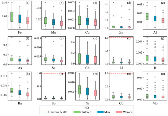 Non-carcinogenic health risks of surface water to children, men, and women: (a) Fe, (b) Mn, (c) Cu, (d) Zn, (e) Al, (f) As, (g) Se, (h) Cd, (i) Li, (j) B, (k) Ba, (l) Sb, (m) Ni, (n) Co, and (o) Mo (sample size = 34).