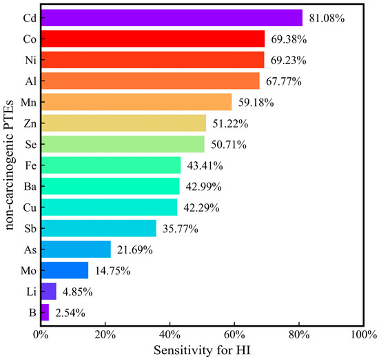 The hazard quotient (HQ) of individual PTEs to children, men, and women was less than 1, indicating that the non-carcinogenic health risks of individual PTEs were within acceptable limits (Figure 5). Sensitivity analyses were performed to identify the sensitivity of the hazard index (HI) to individual PTEs. The HI was highly sensitive to the concentrations of Cd, Co, and Ni, indicating that these concentrations need to be monitored in surface water (Figure 6). The HI was not sensitive to the concentrations of Li and B, indicating that the hazard posed by Li and B was minimal. The non-carcinogenic risks to children were greater than those for men and women, demonstrating that children are more susceptible to the hazards of PTEs in drinking water. This is because children have a lower body weight and a weaker resistance.