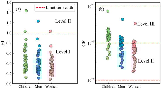 Non-carcinogenic and carcinogenic health risks of PTEs in surface water to children, men, and women: (a) hazard index (HI) and (b) cancer risk (CR) (sample size = 34).