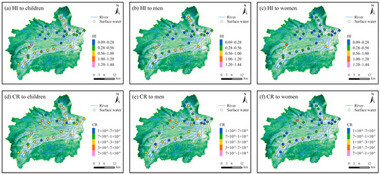 Spatial distribution map of hazard index (HI) and cancer risk (CR) of PTEs in surface water. HI to (a) children, (b) men, and (c) women and CR to (d) children, (e) men, and (f) women (sample size = 34).