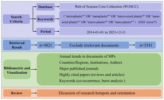 In the pursuit of research hotspots and trends in the field of MNPs’ toxicity, a methodological framework grounded in bibliometric analysis was adopted for this investigation. The flowchart depicting the bibliometric analysis and methodology can be viewed in Figure 1. The WOSCC database encompasses the world’s most vital and influential research literature and is acknowledged as the foremost literature search platform []. Our search strategy of the WOSCC database utilized the terms (“microplastic*” OR “nanoplastic*” OR “micro-sized plastic*” OR “nano-sized plastic*” OR “micro-plastic*” OR “nano-plastic*”) AND (toxic*) and covered the period from 1 January 2014 to 31 December 2023. The literature was further screened based on titles and abstracts, and articles not relevant to the study of MNPs’ toxicity were excluded. Upon screening the search results, any conference abstracts, editorial materials, book chapters, and other materials with limited relevance to the topic were eliminated. The resulting collection of articles (n = 3541) related to MNPs’ toxicity was subjected to a comprehensive research evaluation and scientific mapping. The dataset comprised 2945 research articles and 596 review papers. The data exported from the WOSCC database were exported using the “fully documented and cited references” in TXT format, with the literature search ending on 25 March 2024.