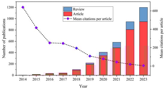 The temporal distribution map of publications associated with this research field grants us valuable insights into the degree of attention they garnered and the progression of trends in the field, thereby elucidating its development over time []. Figure 2 illustrates the growth trend in publications related to MNPs’ toxicity during the period analyzed (2014–2023). The majority of publications from the past decade, specifically over 75%, were published in the past three years. As depicted in Figure 2, a comprehensive assessment of the literature from 2014 to 2023 related to MNPs’ toxicity revealed a continual upward trajectory. The number of published articles rose from a meager 3 in 2014 to a substantial 1199 in 2023. Furthermore, between 2020 and 2023, the rate of articles published annually remained steady, at approximately 266. Notably, the year 2022 witnessed a remarkable surge in the number of articles published, which increased by 363 compared to the previous year, thereby exceeding the average growth rate observed. Between 2014 and 2023, the cumulative citations of articles in this field reached 149,024, and the mean citations per article reached 42.08. Despite the relatively modest volume of publications in the initial years of this study, these early papers were citated more frequently, averaging over 200 citations per paper until 2017. This trend underscores the significant impact of and attention garnered by the foundational research published during this period. However, as the volume of publications expanded in subsequent years, there was a gradual decline in the average citation rate of these articles annually, reflecting the dilutive effect of the increasing number of papers.