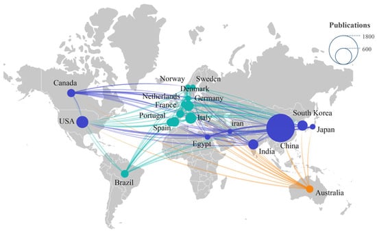 Based on the statistical results of the network map visualization analysis, the collaborative relationships between countries that are related to research published on MNPs’ toxicity from 2014 to 2023 are depicted in Figure 4. As observed in Figure 4, various countries/regions collaborate in order to investigate the toxicity of MNPs, with the USA, Canada, South Korea, Japan, and India being the main countries cooperating with China.