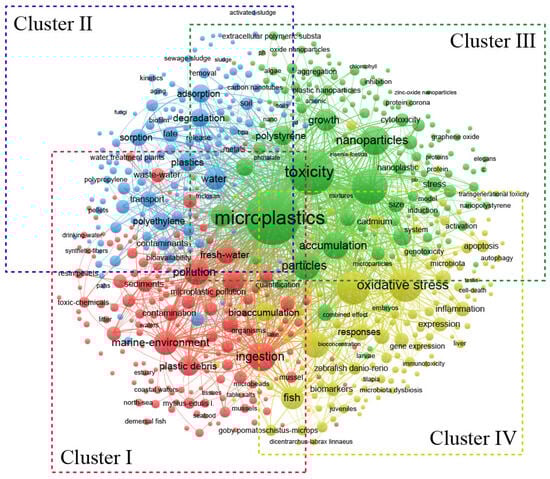 Cluster II (blue cluster): The main keywords in this cluster are “polycyclic aromatic hydrocarbons”, “heavy metals”, “bisphenol A”, and “flame retardants”, indicating that the combined toxicity of MNPs and other contaminants was the primary research focus in this cluster.