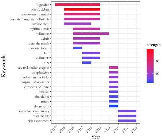 In recent years (2020–2023), the emergence and intensity of keywords such as “Caenorhabditis elegans” and “Danio rerio” have increased. These organisms are considered typical model organisms for studying MNPs’ toxicity as they can reveal the biological effects, physiological changes, and potential ecological risks that result from exposure to MNPs. Additionally, the intensity of the emergence of the keyword “microbial community” was high during this period. Within an ecosystem, microbial communities are responsible for sustaining critical biochemical cycles, including the decomposition of organic matter, nitrogen fixation, and nutrient cycling. The toxic effects of MNPs on microbial communities may directly or indirectly influence their structure and diversity, impacting their functional gene expression and leading to dysfunction in the organic matter decomposition and nutrient cycling processes. These changes ultimately affect the ecosystem’s operation and biochemical cycling []. As microbiology and genomics technology continue to develop, research on the population structure, metabolic pathways, and gene expression of microorganisms affected by MNPs will deepen, facilitating a better understanding of the environmental and ecosystem impacts of MNPs and promoting the prediction and prevention of potential risks.