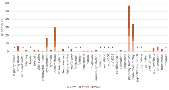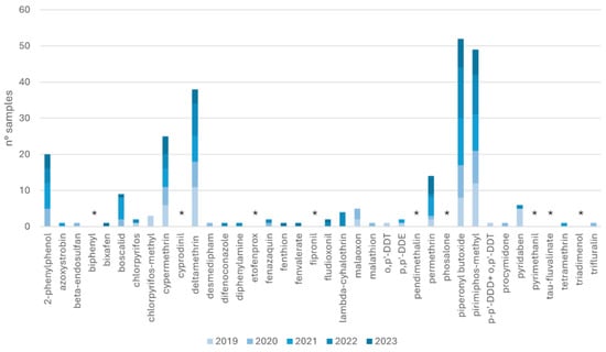 Number of animal-origin-based feedstuff samples contaminated by pesticides from 2019 to 2023. Asterisk refers to compounds not detected in any samples throughout the three years.