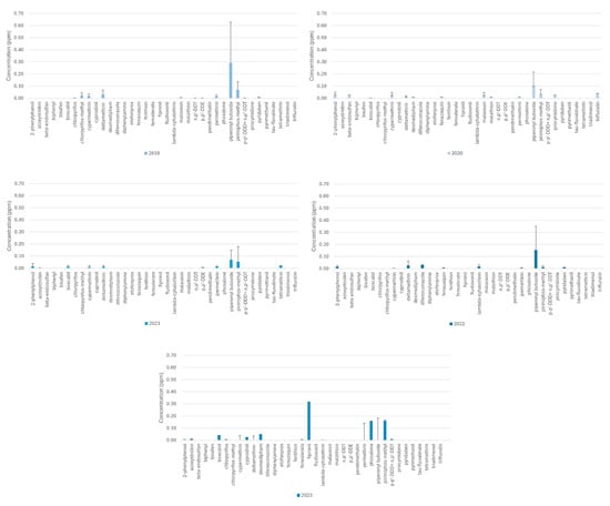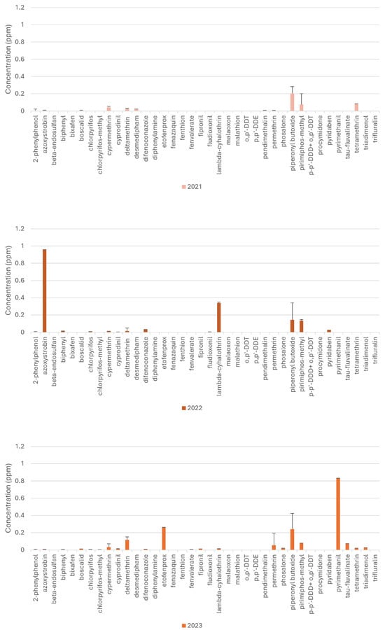 The highest residues were detected in straw (azoxystrobin 0.96 mg/kg), in fodder (cypermethrin 0.143 mg/kg), in oat-based feed (deltamethrin 1.396 mg/kg), in ground corn (piperonyl-butoxide 1.505 mg/kg), in durum wheat bran (pyrimiphos-methyl 0.562 mg/kg), and in a complete feed (tetramethrin 0.083 mg/kg). Figure 2 shows the annual trends of the concentrations of residues detected from 2021 to 2023 in cereal-based feed.