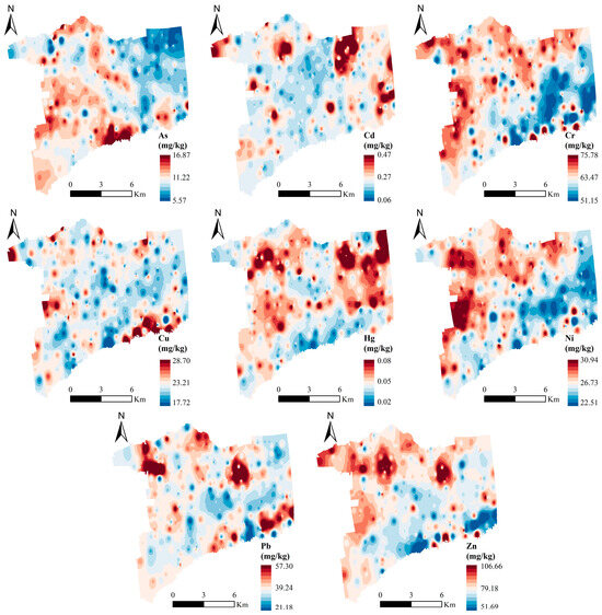 The spatial pattern of PTEs in the study region was obtained by the inverse distance weighting method (Figure 2). The spatial distribution of Cr, Ni, Cu, and Zn in the surface soil exhibited a similar pattern, with elevated concentrations observed in the northern and western regions, declining towards the southeast, and there were no notable peaks in the central area of the town. However, there were sporadic instances of elevated concentrations in the southeast, particularly in the vicinity of the river. The elements Cd and Hg exhibited a comparable spatial distribution, characterized by elevated concentrations near agricultural lands in rural settlements. Similarly, As and Pb showed a related distribution, with high concentrations localized to areas adjacent to rivers.