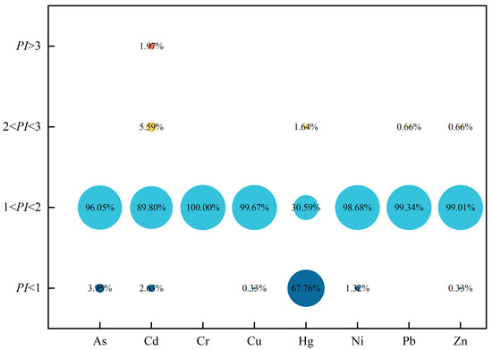 Grading based on the calculated PI values (Figure 3) showed that 3.95%, 2.63%, 0.33%, 67.76%, 1.32%, and 0.33% of the samples were As, Cd, Cu, Hg, Ni, Pb, and Zn, indicating that the samples were non-polluted (PI < 1). Meanwhile, 96.05%, 89.80%, 100.00%, 99.67%, 30.59%, 98.68%, 99.34%, and 99.01% of the samples were As, Cd, Hg, Pb, and Zn, indicating that they were lightly polluted (1 < PI < 2). In addition, Cd, Hg, Pb, and Zn moderately contaminated samples, accounting for 5.59%, 1.64%, 0.66%, and 0.66% (2 < PI < 3). Lastly, there were individual samples of Cd in a state of strong contamination, which accounted for only 1.97% (PI > 3).