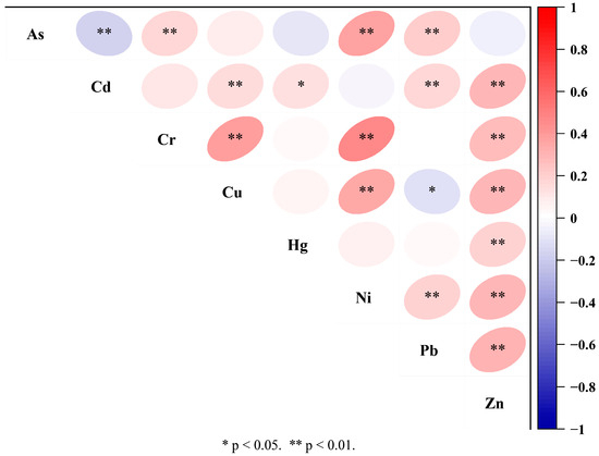 PC1 primarily represented Cr, Cu, Ni, and Zn. Combined with the results of Pearson’s correlation analysis (Figure 4), there was a significant positive correlation between Cr, Cu, Ni, and Zn (p < 0.01), indicating that the four elements were most likely from the same source, which was consistent with the results of PCA. In terms of spatial distribution (Figure 2), the four elements of Cr, Cu, Ni, and Zn had similar spatial distribution patterns and were more evenly distributed spatially, and they are less affected by human activities and their genesis is generally related to the soil-forming parent material [31]. The geologic construction of the study region is all Quaternary stratigraphy, which is relatively homogeneous. Therefore, PC1 was described as a natural source.