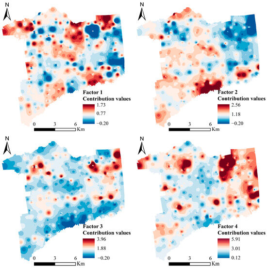 Factor 3 was dominated by Hg. By comparing the spatial distribution (Figure 2) of Hg with the distribution of the factor 3 contribution values (Figure 6), it was found that the high-value overlap area was located near the towns and villages. Hg is mainly influenced by a combination of human activities and other factors [45], and in the study area, it mainly comes from burning coal for heating in winter. The combustion of coal produces a large amount of Hg-containing vapor that is emitted into the atmosphere and subsequently deposited into the nearby soil, causing pollution [46,47]. Therefore, we defined factor 3 as a fuel source.