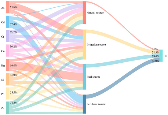 The pollution sources affecting the potential ecological risk of the soil were ranked in the following descending order: fertilizer source > fuel source > irrigation source > natural source (Figure 7).