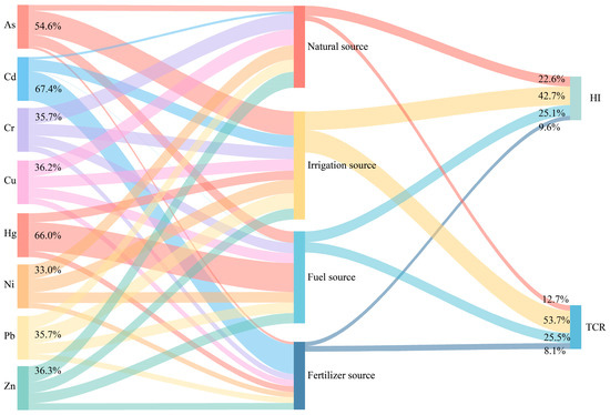 The HI findings indicate that children experience elevated health risks in contrast to adults. Consequently, this study concentrated its analysis on children as a definitive group [29]. As can be seen in Figure 8, the irrigation source was the primary source of health risk, contributing 42.7% and 53.7% to the HI and carcinogenic risk TCR, respectively, with the PTEs being dominated by As and Pb. Arsenic and lead are highly toxic. Above certain concentrations, they can damage the brain and nervous system [57,58]. Therefore, control of irrigation sources needs to be strengthened. The fuel source was the secondary source of health risk, contributing 25.1% and 25.5% to the HI and TCR, respectively, with the PTEs being dominated by Hg. Mercury deposition can be enriched in the body through bioaccumulation, presenting a significant risk to human health; for instance, chronic exposure at low levels during pregnancy may lead to a decrease in the intelligence quotient of the offspring [59]. Therefore, the control of fuel sources needs to be strengthened.