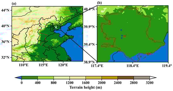 Maps displaying the terrain height for (a) North China and (b) the Tangshan region. In (a), the radiosonde station is indicated by a white cross. In (b), the air quality monitoring stations are represented by red dots, while the ground–level meteorological stations are marked with blue crosses. The red contour in (b) delineates the boundary of Tangshan.