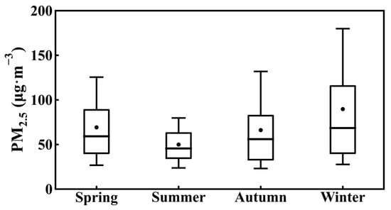 Seasonal variations of observed PM2.5 concentrations in Tangshan, based on ground-level measurements from 2015 to 2019. In the boxplot, the central box represents the interquartile range (25th to 75th percentile), the vertical line extends from the 10th to 90th percentile, the solid line within the box denotes the median, and the dot represents the mean value.