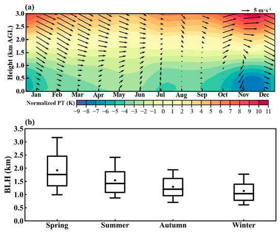 (a) Time–height sections of monthly normalized potential temperature (PT), with overlaid horizontal wind vectors (black arrows), and (b) seasonal variations of boundary layer height (BLH) at 14:00 LT in Tangshan, derived from the ERA5 dataset. In (a), the PT profile for each month is normalized by subtracting the mean value below 3000 m. In (b), the central box represents the interquartile range (25th to 75th percentile), the vertical line extends from the 10th to 90th percentile, the solid line within the box denotes the median, and the dot represents the mean value.