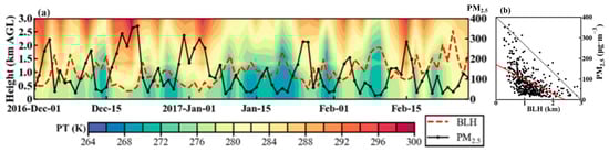 (a) Time–height sections of PT from 1 December 2016 to 28 February 2017, overlaid with BLH (marked by a red dashed line) at 14:00 LT and daily mean PM2.5 concentration (marked by a black dotted line), and (b) scatter plot comparing BLH at 14:00 LT and daily mean PM2.5 concentration for all winters from 2015 to 2019. In (b), the gray diagonal line represents a 1:1 reference line, and the red line shows the least squares fitting line. The PBL data were derived from the ERA5 dataset, and the PM2.5 concentration is based on measurements.