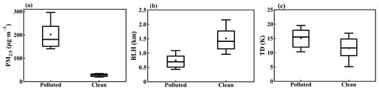 Differences between polluted and clean days in (a) daily mean PM2.5 concentrations, (b) BLH, and (c) the thermal difference (TD) between surface and 3000 m at 14:00 LT. In the boxplot, the central box represents the interquartile range (25th to 75th percentile), the vertical line extends from the 10th to 90th percentile, the solid line within the box denotes the median, and the dot represents the mean value. Results are calculated from PM2.5 measurements and ERA5 data in Tangshan during the winters of 2015–2019.