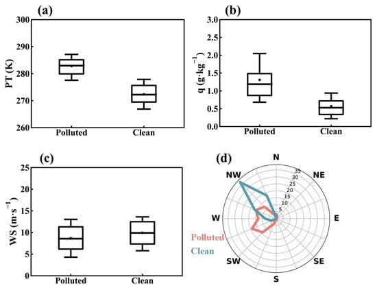 Differences between polluted and clean days in (from left to right) (a) PT, (b) specific humidity (q), (c) wind speed (WS), and (d) wind direction at 850 hPa in Tangshan during the winters of 2015–2019. The data were derived from the ERA5 dataset at 14:00 LT. In the boxplot, the central box represents the interquartile range (25th to 75th percentile), the vertical line extends from the 10th to 90th percentile, the solid line within the box denotes the median, and the dot represents the mean value.