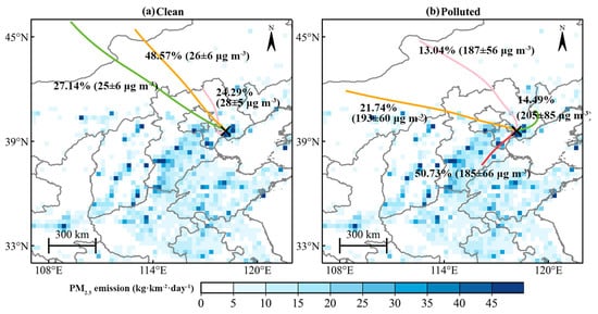 Spatial distribution of MEIC PM2.5 emissions in winter, overlaid with 24 h backward trajectory clustering for (a) clean days and (b) polluted days from 2015 to 2019. The mean and standard deviation of PM2.5 concentrations are indicated under each trajectory. The endpoint of backward trajectories is denoted by a black cross in each panel. The radiosonde station of Tangshan is marked with a black cross.