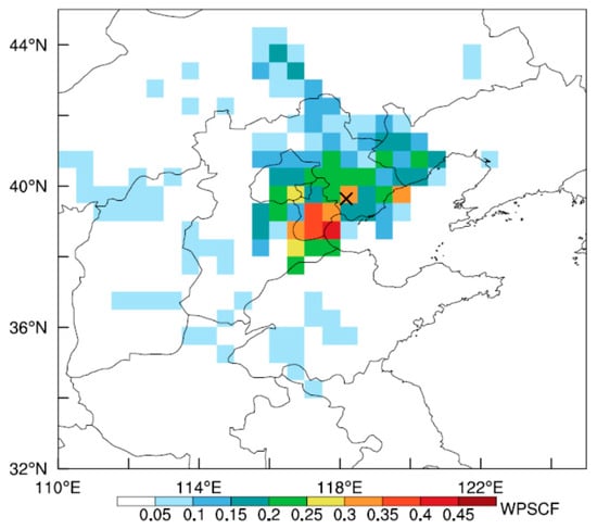 Maps of the Weighted Potential Source Contribution Function (WPSCF) for the top 20% of PM2.5 pollution in Tangshan, based on the concentration threshold of 134 μg m−3. The endpoint of the backward trajectories is indicated by a black cross.