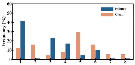 The occurrence frequency of polluted days (top 20% concentration, orange bars) and clean days (bottom 20% concentration, blue bars) under different classified synoptic types.