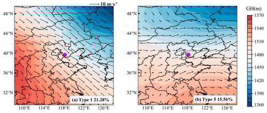The 850 hPa geopotential height (GH) fields (color shading) of (a) Type 1 and (b) Type 5 identified using the T–PCA method, overlaid with wind vector fields (black arrows). The occurrence frequency (%) is indicated at the bottom of each panel, and the radiosonde station of Tangshan is marked with a purple dot.