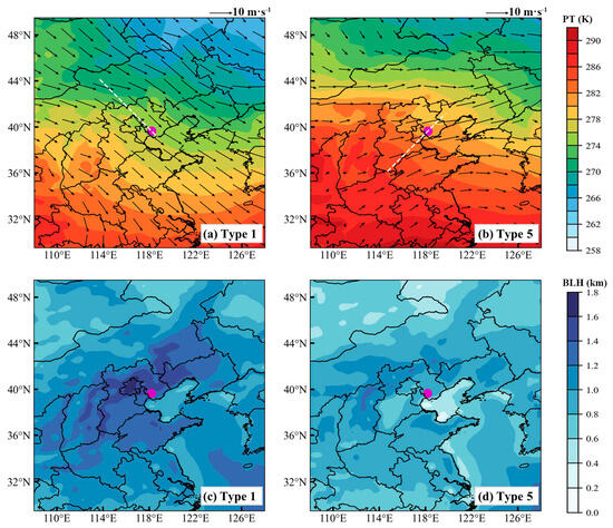 Spatial distributions of (a,b) 850 hPa PT overlaid with horizontal wind vector fields (black arrows) and (c,d) averaged BLH, under the influence of synoptic Type 1 (left panels) and synoptic Type 5 (right panels). The white dashed lines indicate the locations of cross sections shown in Figure 12. The radiosonde station of Tangshan is marked with a purple dot. The data were derived from the ERA5 dataset at 14:00 LT.