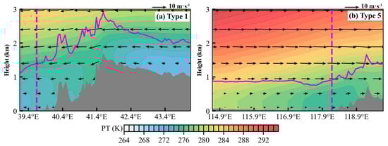 Vertical cross sections of PT and wind along the prevailing wind direction, cutting through Tangshan under of (a) synoptic Type 1 and (b) synoptic Type 5. The black arrows represent the 3D wind field projected onto the cross–sections, with vertical velocity multiplied by a factor of 20. The location of Tangshan is marked by the purple dashed line, and the BLH is indicated by the purple solid line in each panel. The data were derived from the ERA5 dataset at 14:00 LT.