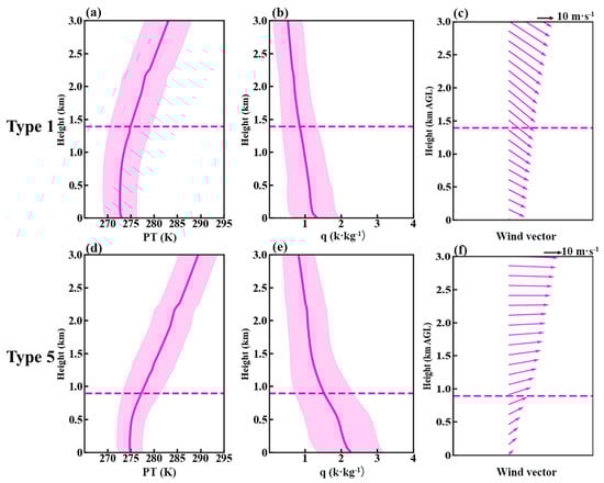 Vertical profiles of (a,d) PT (mean ± standard deviation), (b,e) q (mean ± standard deviation), and (c,f) horizontal wind vector (purple arrows) under polluted days in synoptic Type 5 and clean days in synoptic Type 1 at 14:00 LT in Tangshan. The purple dashed lines indicate the mean BLH for each type. The data were derived from the ERA5 dataset.