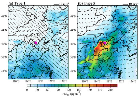 Averaged near–surface PM2.5 concentrations overlaid with 850 hPa wind vector fields (black arrows) during (a) clean days under synoptic Type 1 and (b) polluted days under synoptic Type 5. The radiosonde station of Tangshan is marked with a purple dot. PM2.5 concentration data were derived from the CAQRA dataset, and meteorological data were from ERA5.