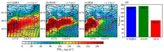 Spatial distributions of ground-level daily PM2.5 concentrations and 10 m wind (black arrows) in Tangshan on 3 December 2016, derived from (a) the CAQRA dataset, and the WRF–Chem (b) BASE run and (c) BLK run. In (d), the daily PM2.5 concentrations in Tangshan (outlined by the purple rectangle in (a–c) are displayed). The red contour delineates the boundary of Tangshan.
