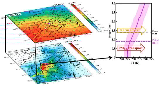 - Li, Q.; Wu, B.; Liu, J.; Zhang, H.; Cai, X.; Song, Y. Characteristics of the atmospheric boundary layer and its relation with PM2.5 during haze episodes in winter in the North China Plain. Atmos. Environ. 2020, 223, 117265. [Google Scholar] [CrossRef]