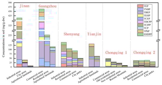 | Jinan | ∑OPE10 | 34.9 | 106 | 2.55–581 | Industrial soils have significantly higher levels of ΣOPE compared with those in urban and farmland soils | [25] |