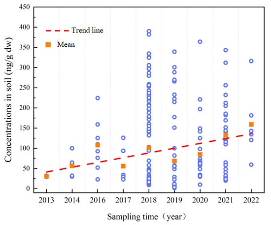 3.2.3. OPE Exposure Levels in Soil at Different Times